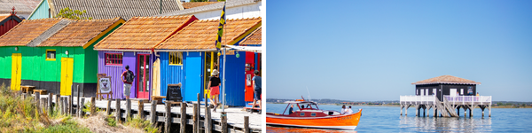 v.l.n.r. oesterhaven bij Château d'Oléron (c) Arthur Habudzik | cabane tsanquee in de Baai van Arcachon (c) G. Cassia